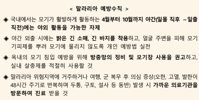 - 모기 물림 방지: 말라리아 매개 모기에 의해 전염되므로 모기가 활동하는 저녁이나 밤 시간대에는 모기 방충제를 사용하거나 장갑, 장화를 착용하는 것이 중요합니다.