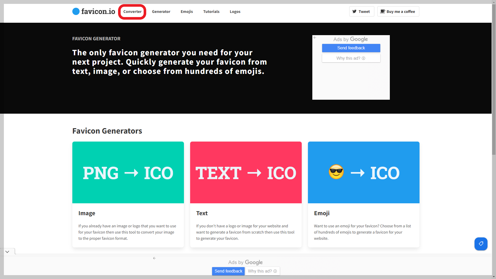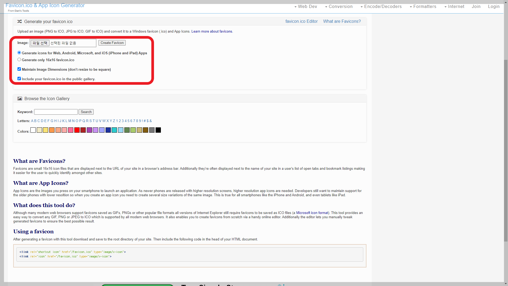 사이트 특징으로는 이미지를 컨버트 할 경우, 매우 간단하게 파비콘으로 사용하는 아이콘만을 생성해 줍니다.